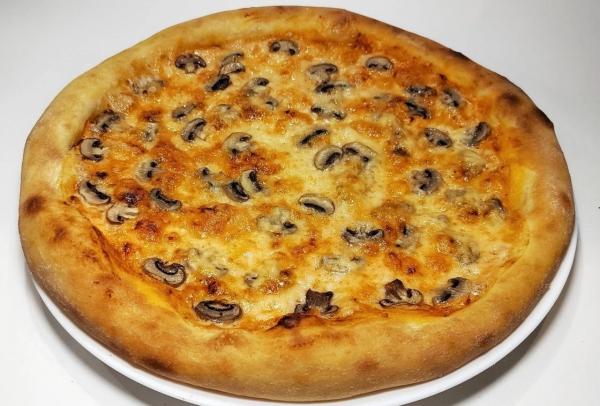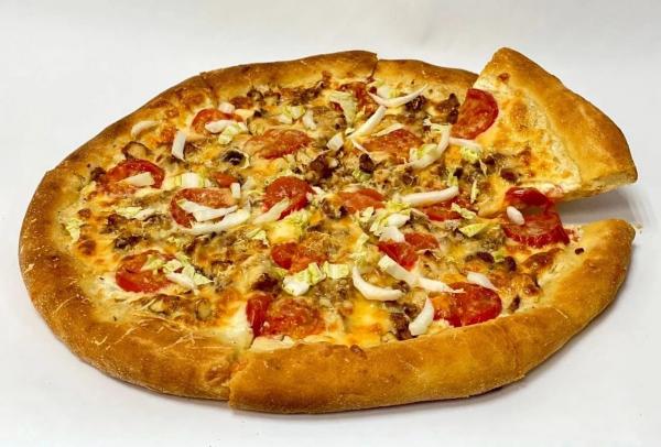 Состав: моцарелла, соус, грибы, кабачки, картошка фри, помидоры, зелень, кукуруза