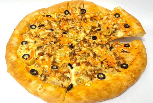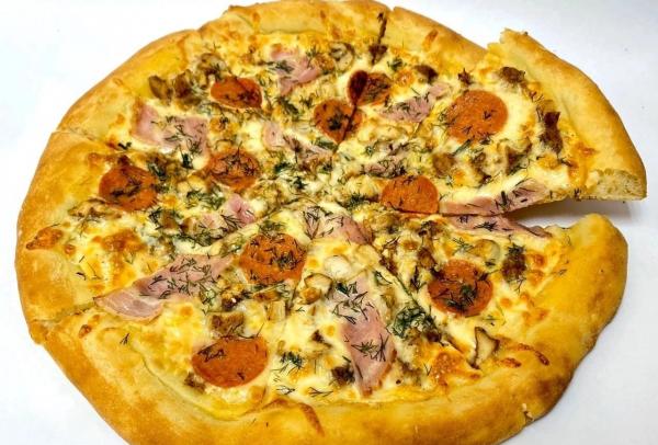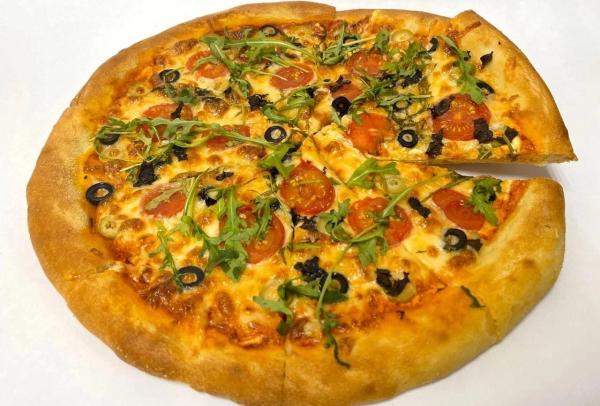 Состав: томатный соус, оливки и маслины, базилик, руккола, помидоры, моцарелла и пармезан