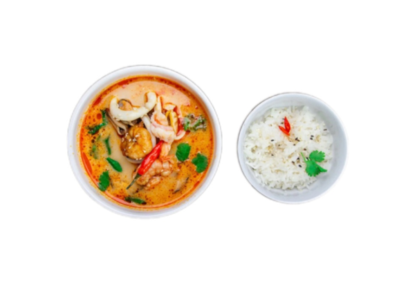 Состав: рис, том ям паста, кокосовое молоко, помидоры черри, шампиньоны, креветки