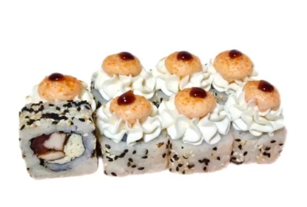 Состав: рис, нори, курица,сыр моцарелла, помидоры, кунжут, сливочный сыр, сырный соус, унаги соус