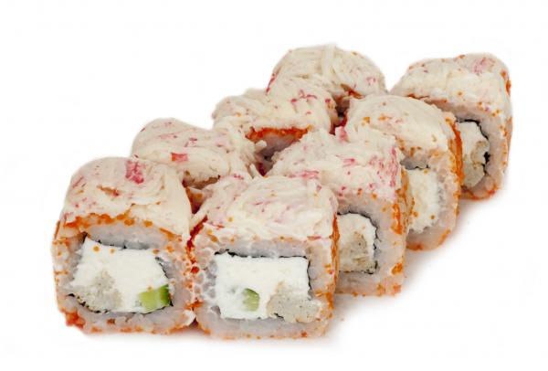 Состав: рис, нори, сливочный сыр, омлет, краб, огурец, тобико