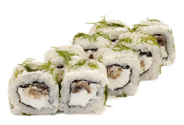 Состав: рис, нори, сливочный сыр, шампиньоны жареные, укроп