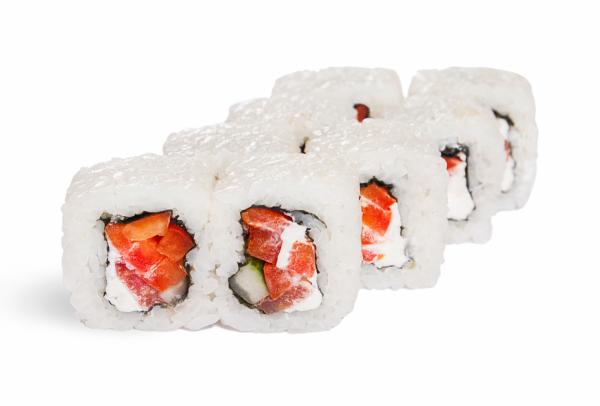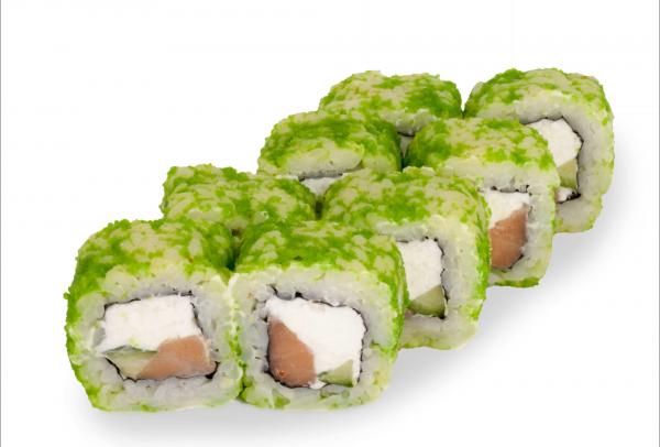 Состав: рис, нори, сливочный сыр, огурец, лосось, тобико