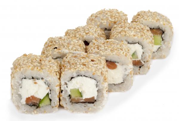 Состав: рис, нори, огурец, сливочный сыр, огурец, лосось, кунжут