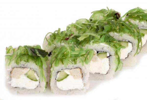 Состав: рис, нори, огурец, омлет, сливочный сыр, салат чука, ореховый соус