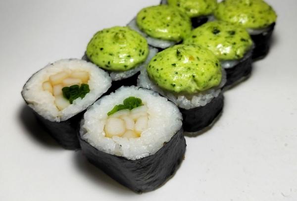 Состав: рис, нори, кальмар, зеленый лук, соус нежный