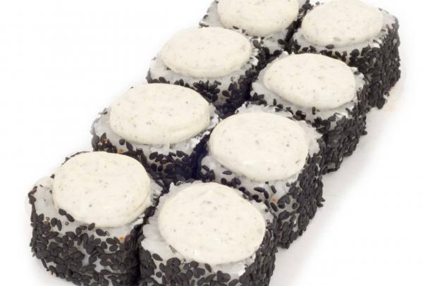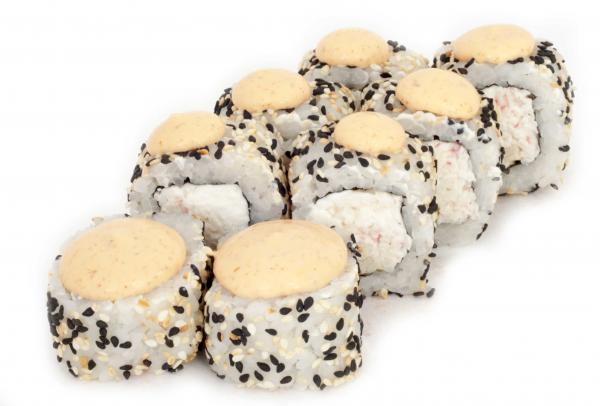 Состав: рис, нори, сливочный сыр, омлет, краб, спайс соус, кунжут белый, кунжут черный