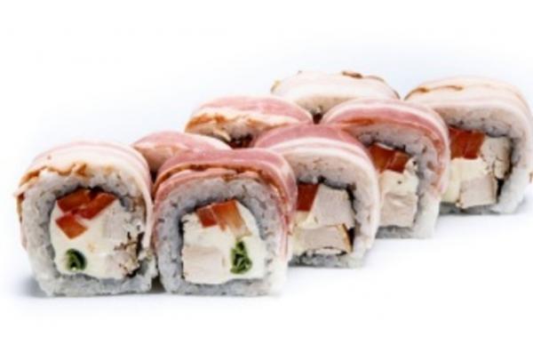 Состав: рис, нори, сливочный сыр, бекон, болгарский перец, пекинская капуста, омлет