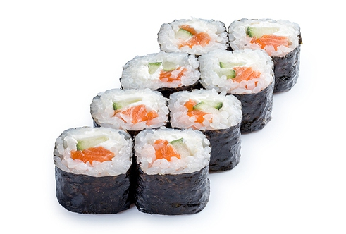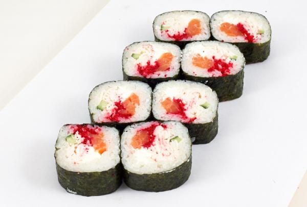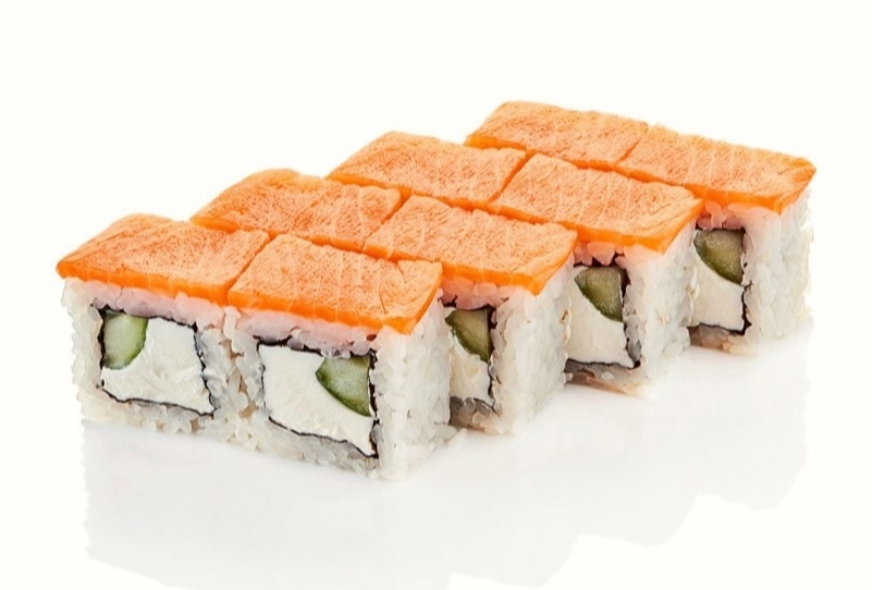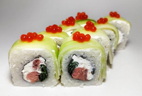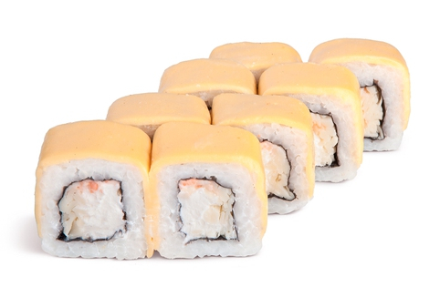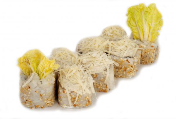 Состав: рис, нори, лист салата, сливочный сыр, курица копчёная, соус цезарь, сыр пармезан