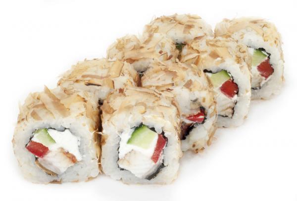 Состав: рис, нори, угорь, болгарский перец, огурец, сливочный сыр, тобико, стружка тунца