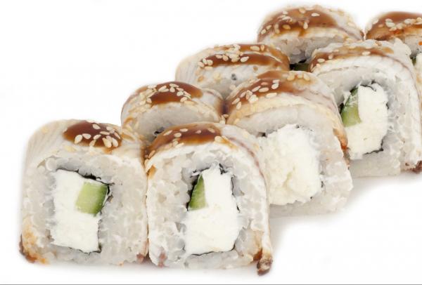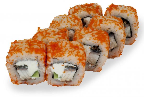 Состав: рис, нори, угорь, сливочный сыр, огурец, масаго