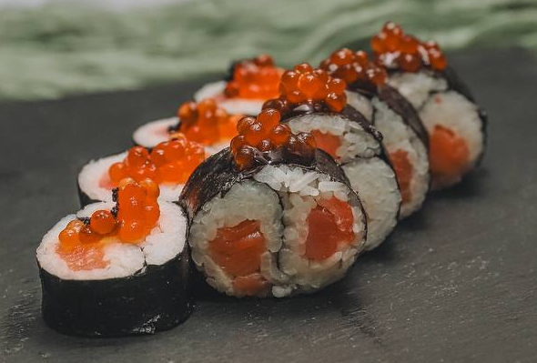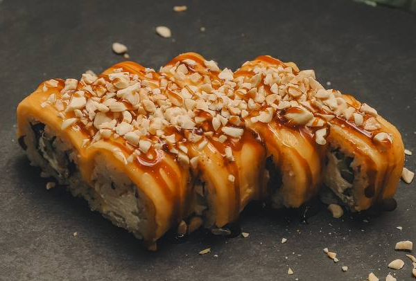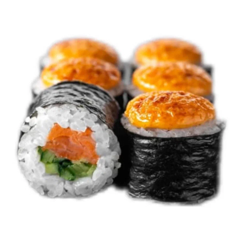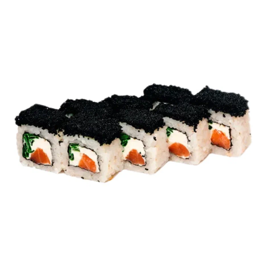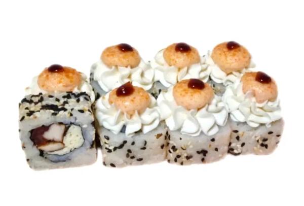 Состав: рис, нори, сливочный сыр, лосось, огурец, масаго, сырный соус, унаги соус