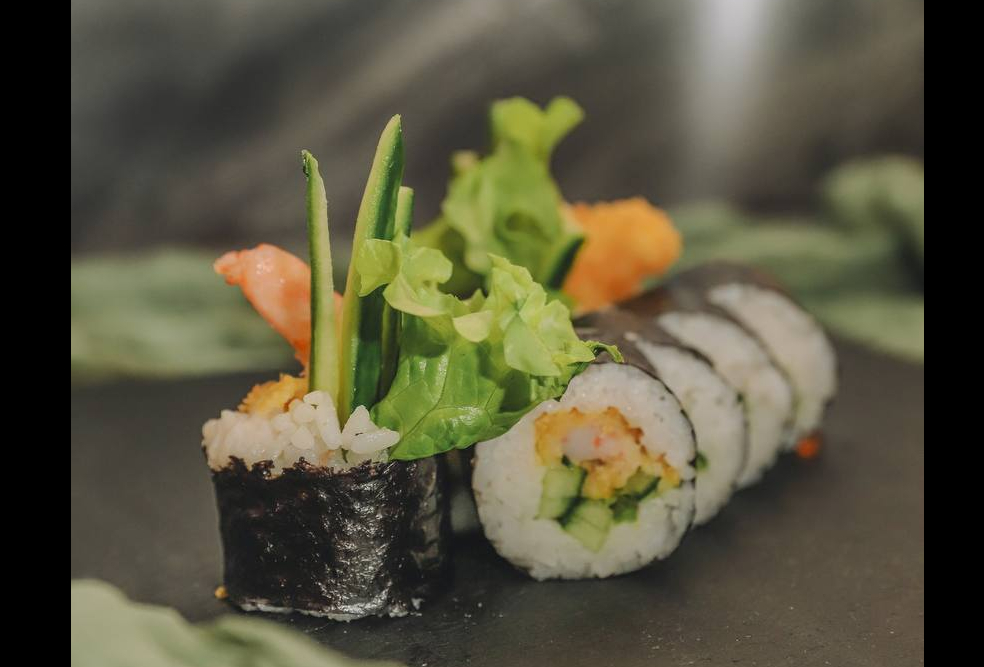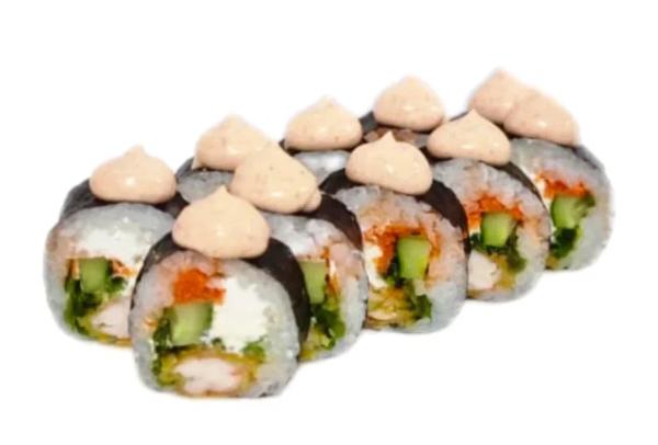 Состав: рис, нори, темпурная креветка, огурец, морковь, сливочный сыр, спайс соус