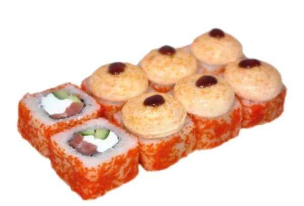 Состав: ига запеченная, тори сливочный, аляска ½, креветка фреш ½, острый маки с лососем