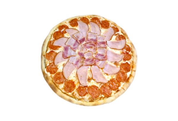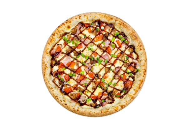 Состав: соус, моцарелла, бекон, курица терияки, помидоры, соус терияки, зеленый лук
