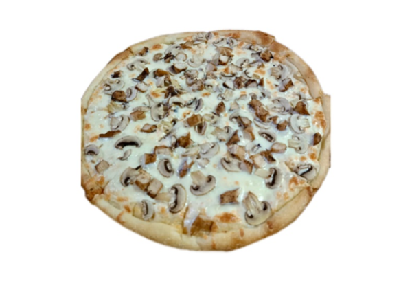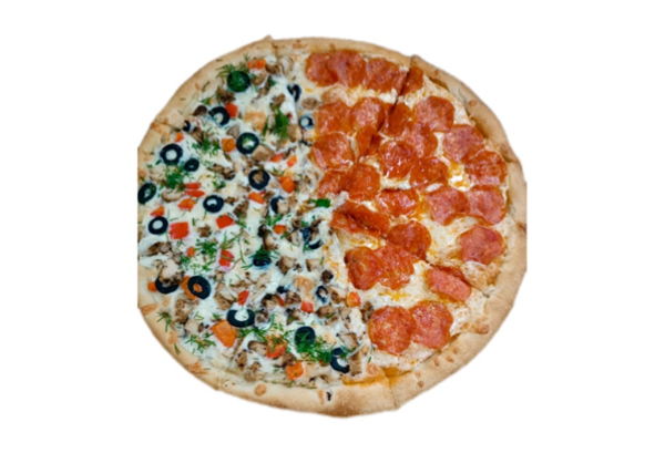Состав: соус томатный, чесночный соус, моцарелла, пепперони, курица, болгарский перец, маслины, зелень