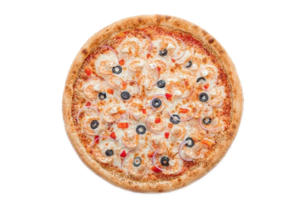 Состав: моцарелла, кальмар, креветки, красный лук, маслины, болгарский перец
